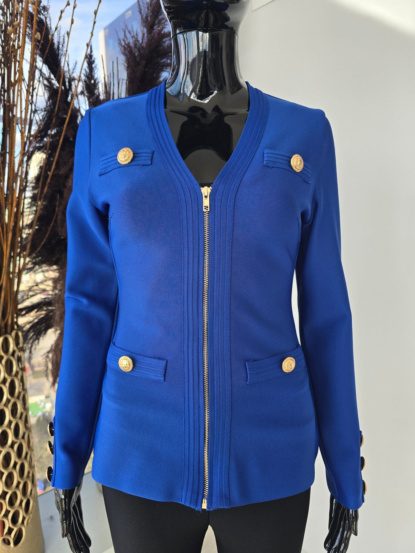 - Other Feature(s): Contouring features, gold accents and faux pockets. Wear it as a jacket or top.